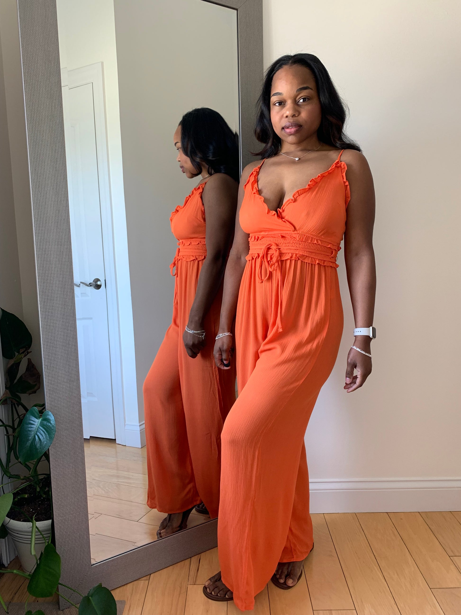 Step into soft sophistication with the Serena Wrap Jumpsuit—a flowy, romantic silhouette made to move with ease. Featuring a ruffled V-neckline, adjustable cami straps, and a flattering wrap design, this one-piece cinches at the waist with a drawstring and falls into wide, full-length legs. Elegant yet effortless, it's your go-to for warm days, special occasions, or elevated everyday looks.