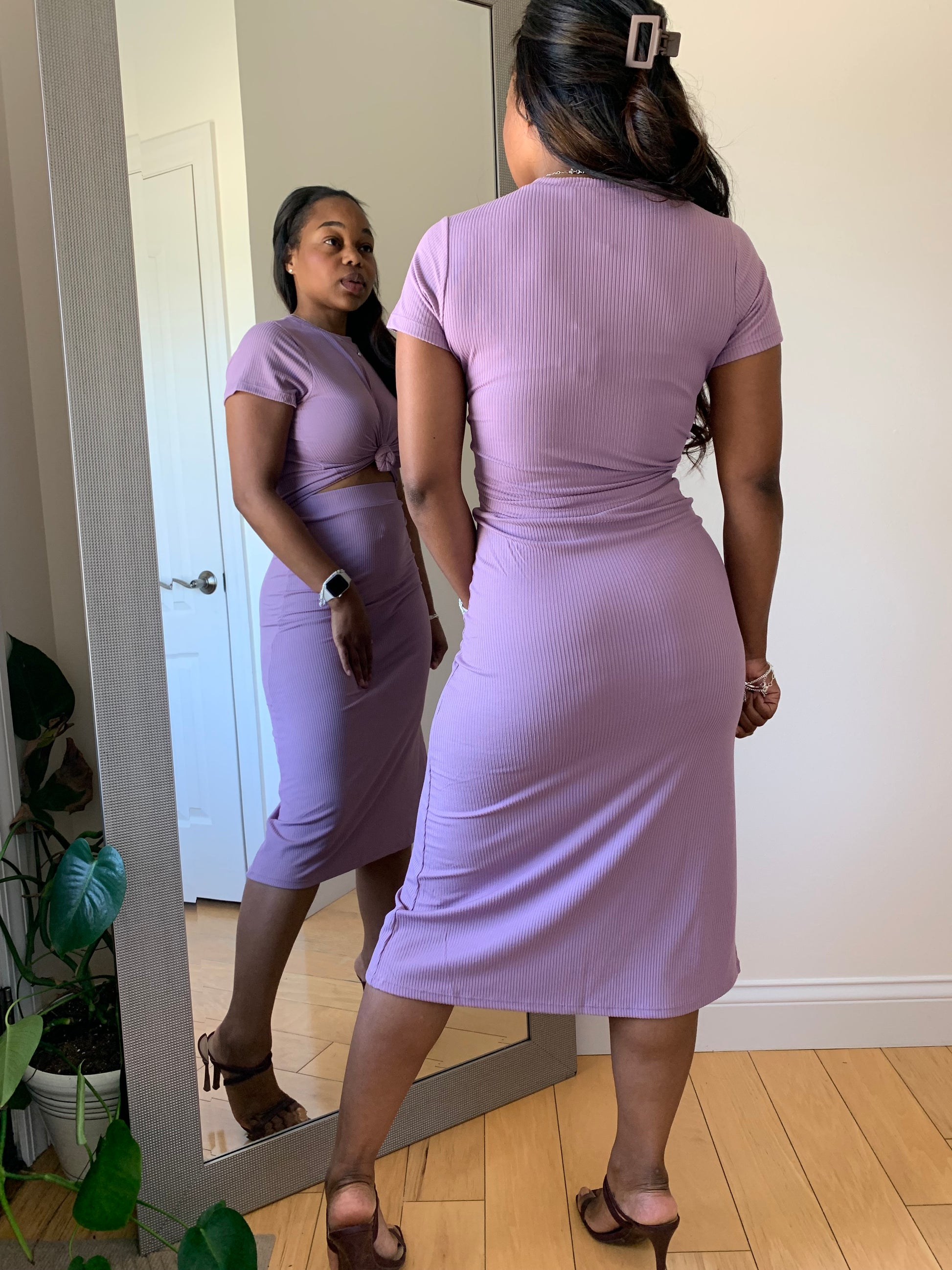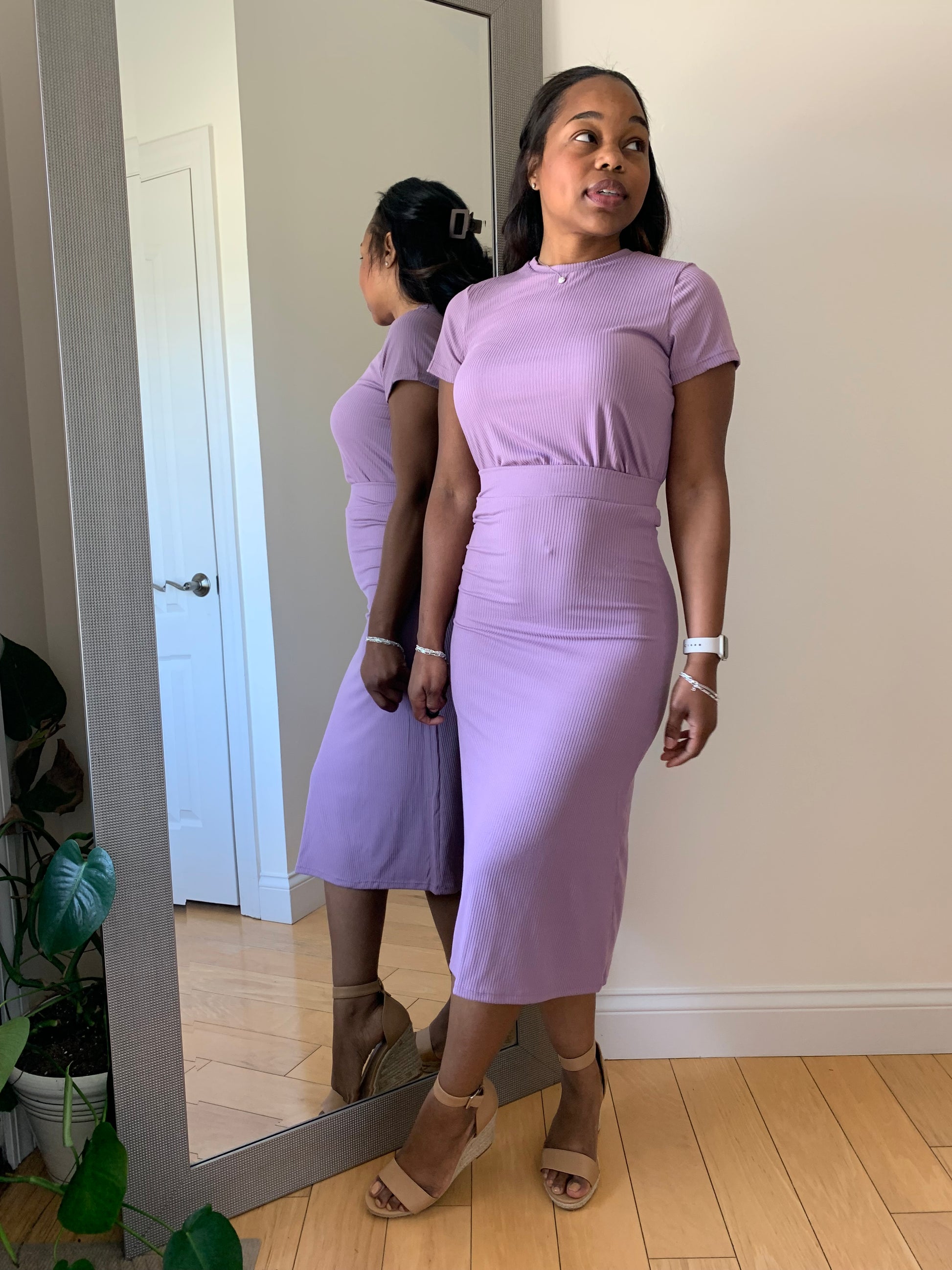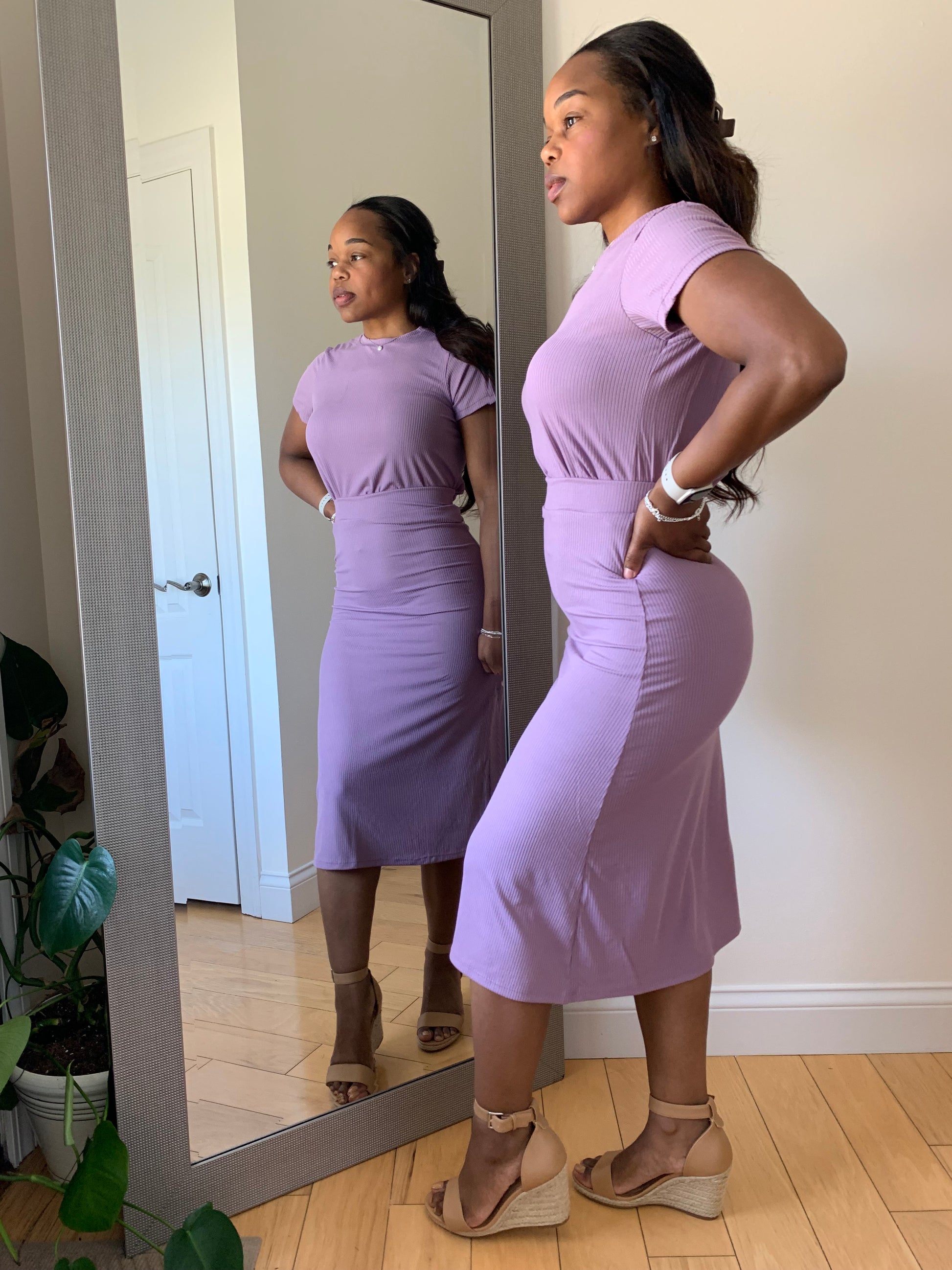 Redefine your everyday look with the First Lady Set! This matching short sleeve ribbed top and midi skirt delivers understated sophistication with a body-hugging fit and clean lines. Designed in a soft, high-stretch rib knit, this set offers both comfort and confidence in one versatile silhouette. Whether styled up or down, it’s a ready-made outfit you’ll reach for again and again. Can be paired with heels for brunch, sneakers for an effortless casual look or sandals for church.