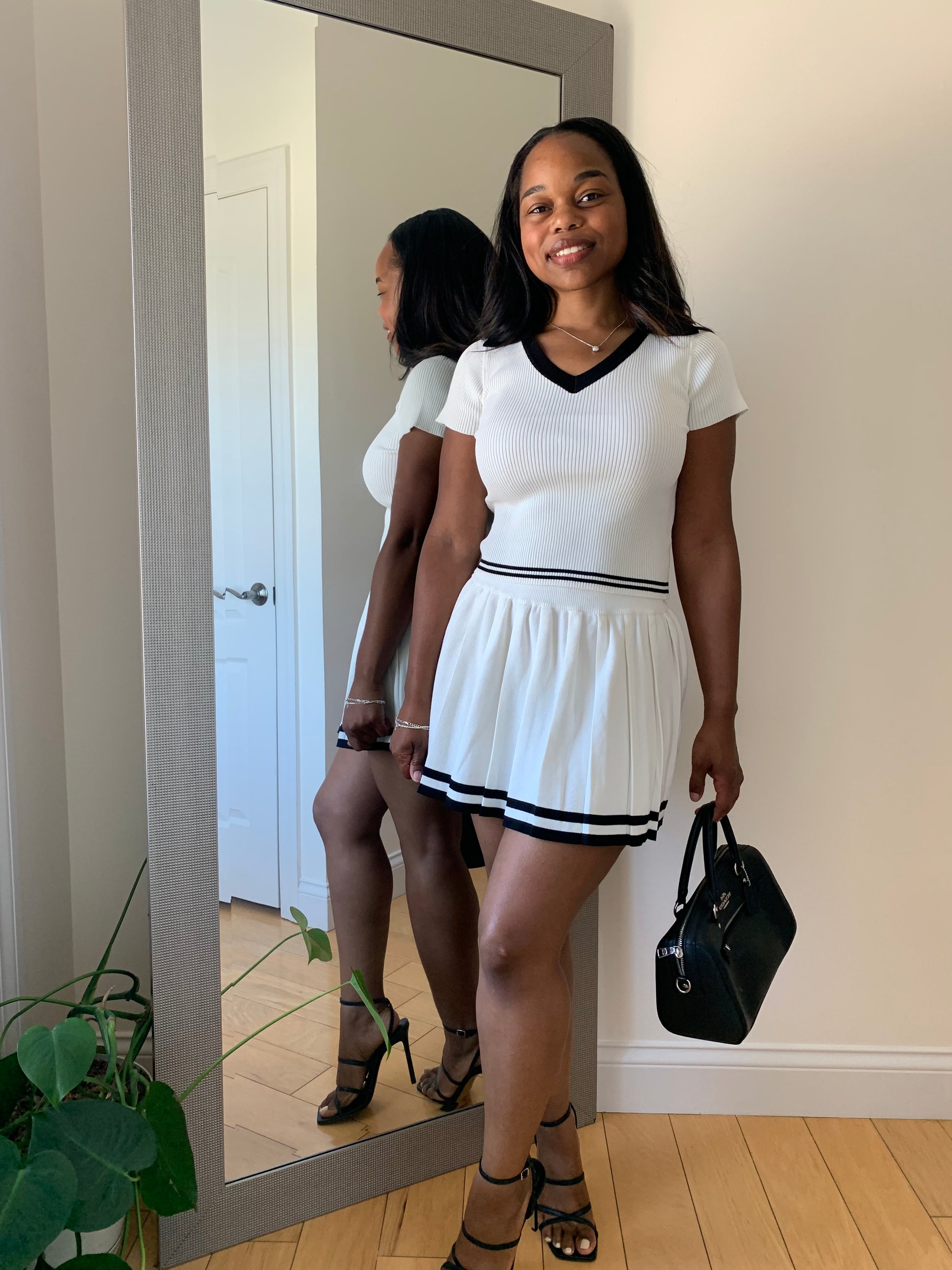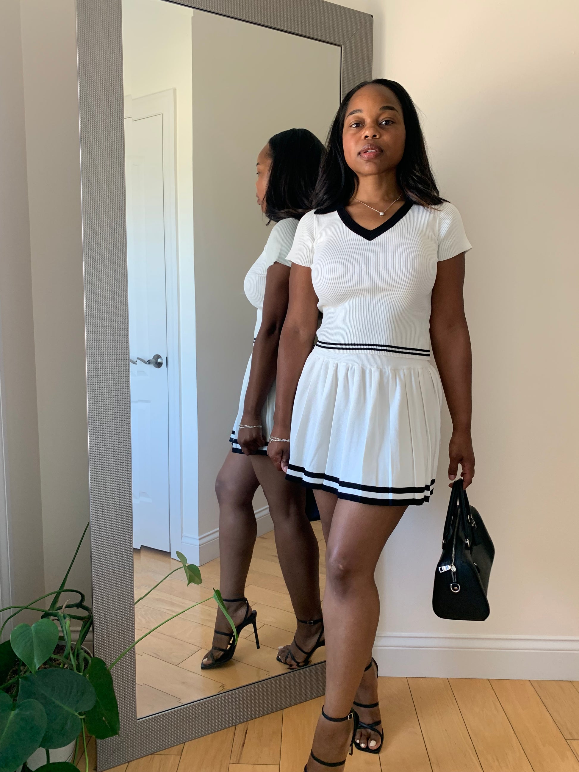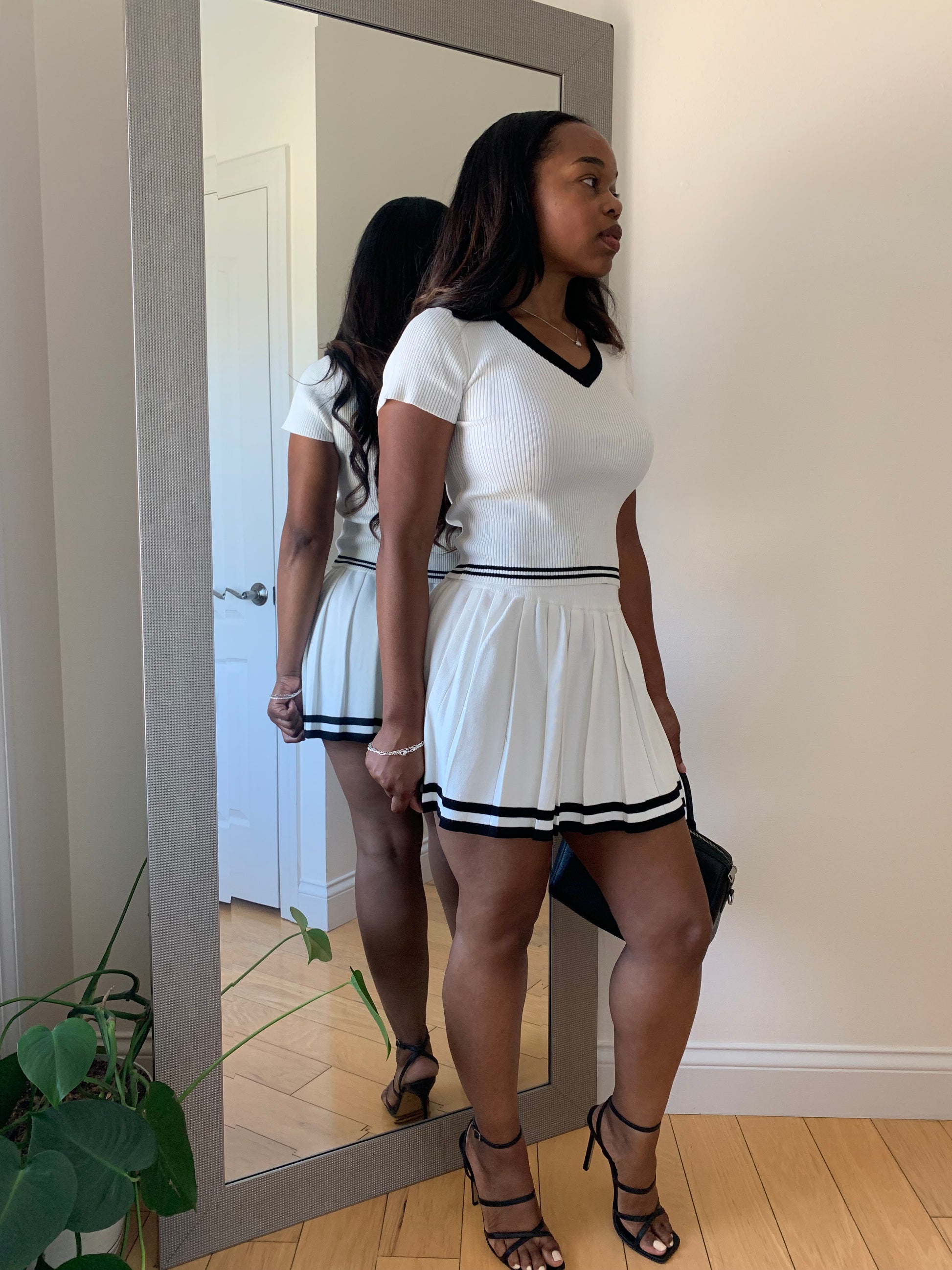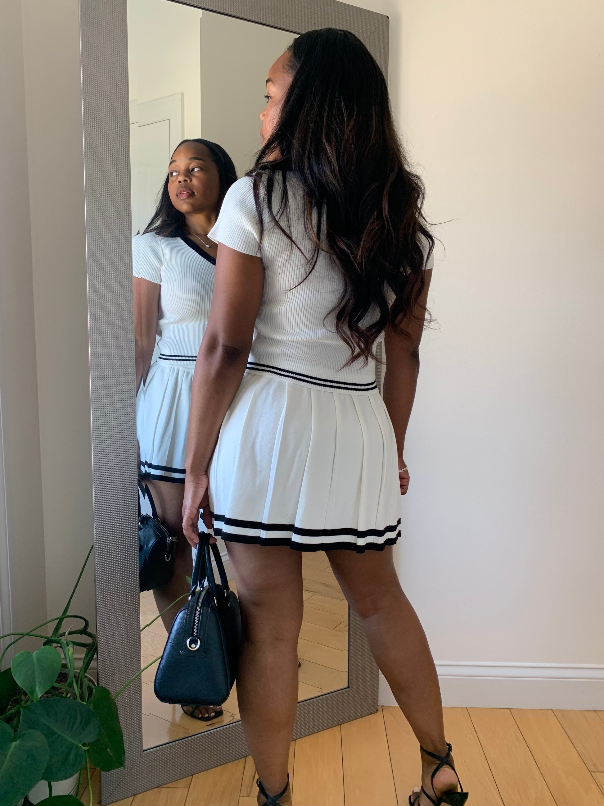 From coffee dates to city strolls—the Harper keeps it cool and polished. This knit two-piece set features a short sleeve collared top with contrast striping and a pleated mini skirt to match. The soft ribbed knit offers all-day comfort with just the right amount of stretch, making it your new go-to for days you want to look effortlessly put together.