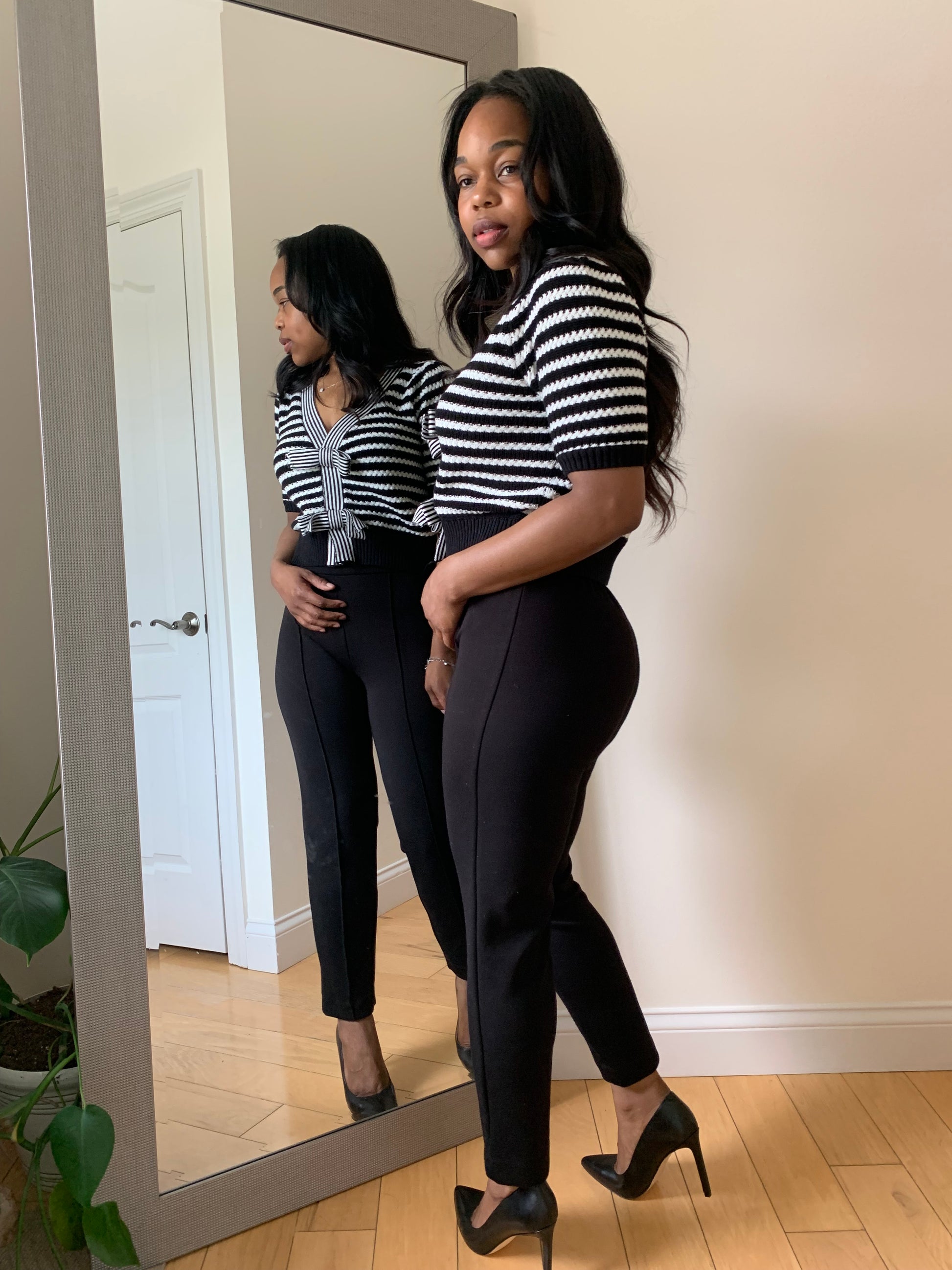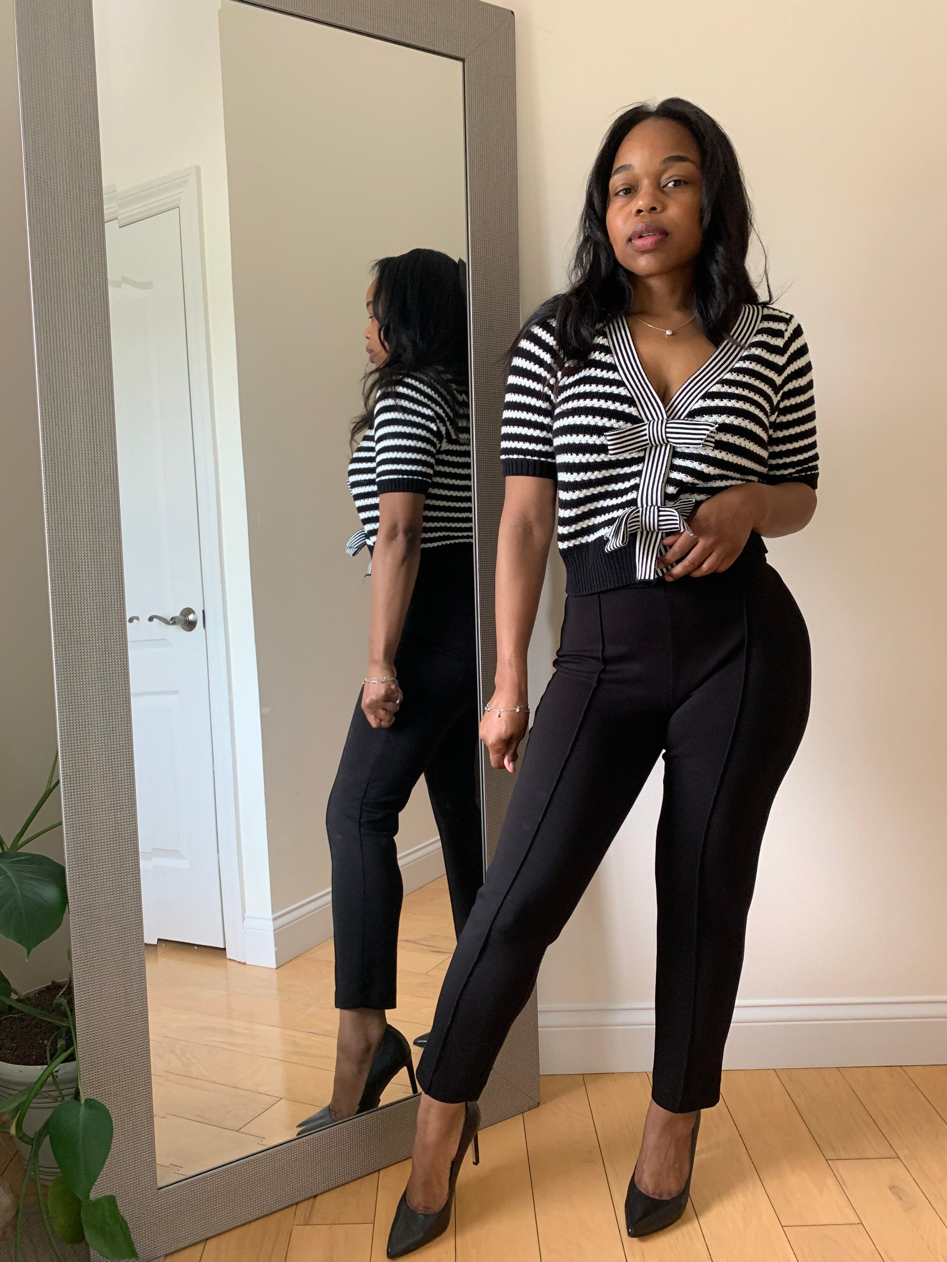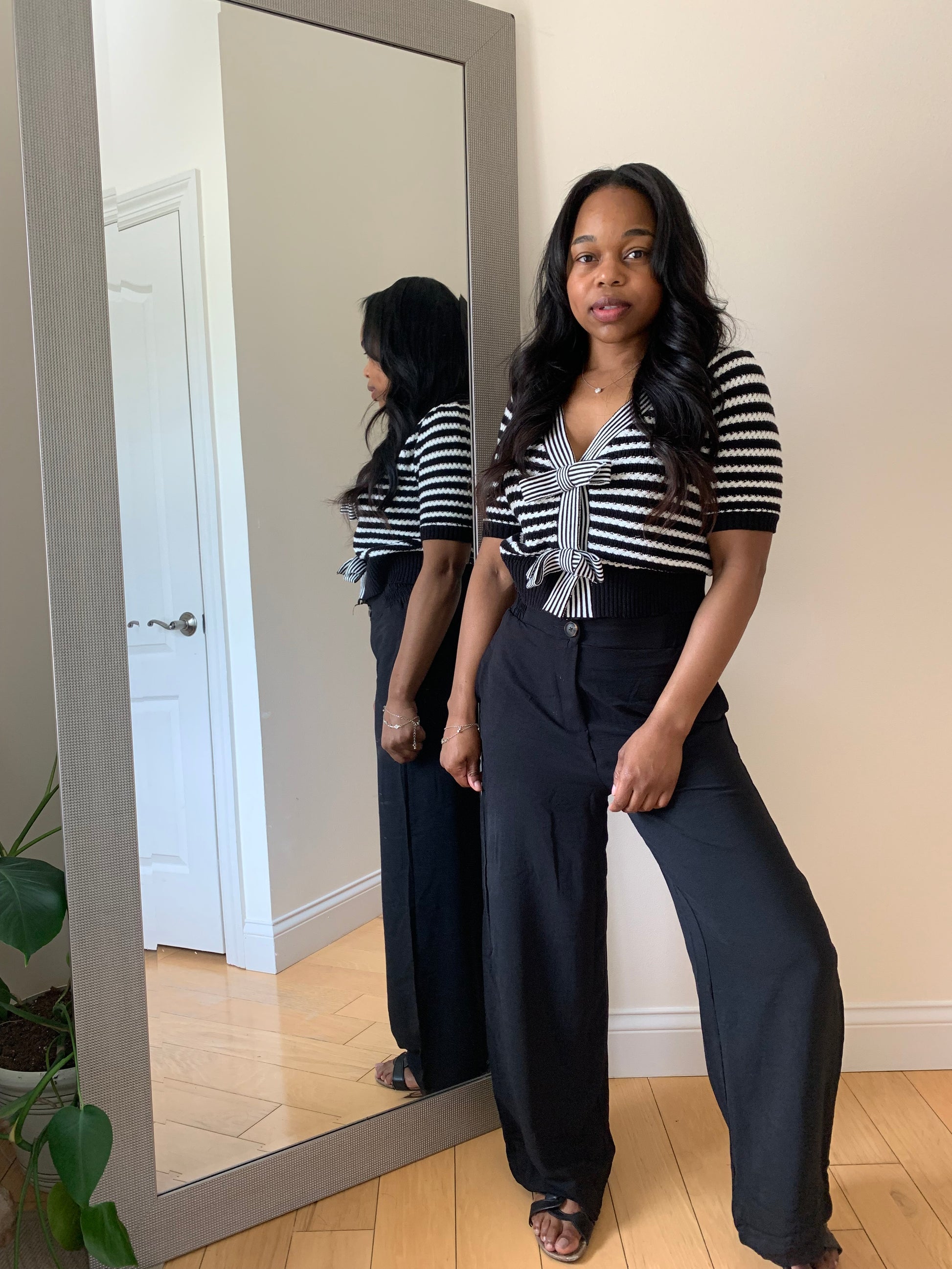 Classic with a twist. The Luxe Lines Cardigan in Black features modern stripes, a flattering v-neckline, and soft knit comfort. Pairs great with our City Sleek Trousers, our Vegan Leather Midi, or Power Flow Flow Trousers. Can be dressed up for work or night out or down for an effortless elevated casual look.