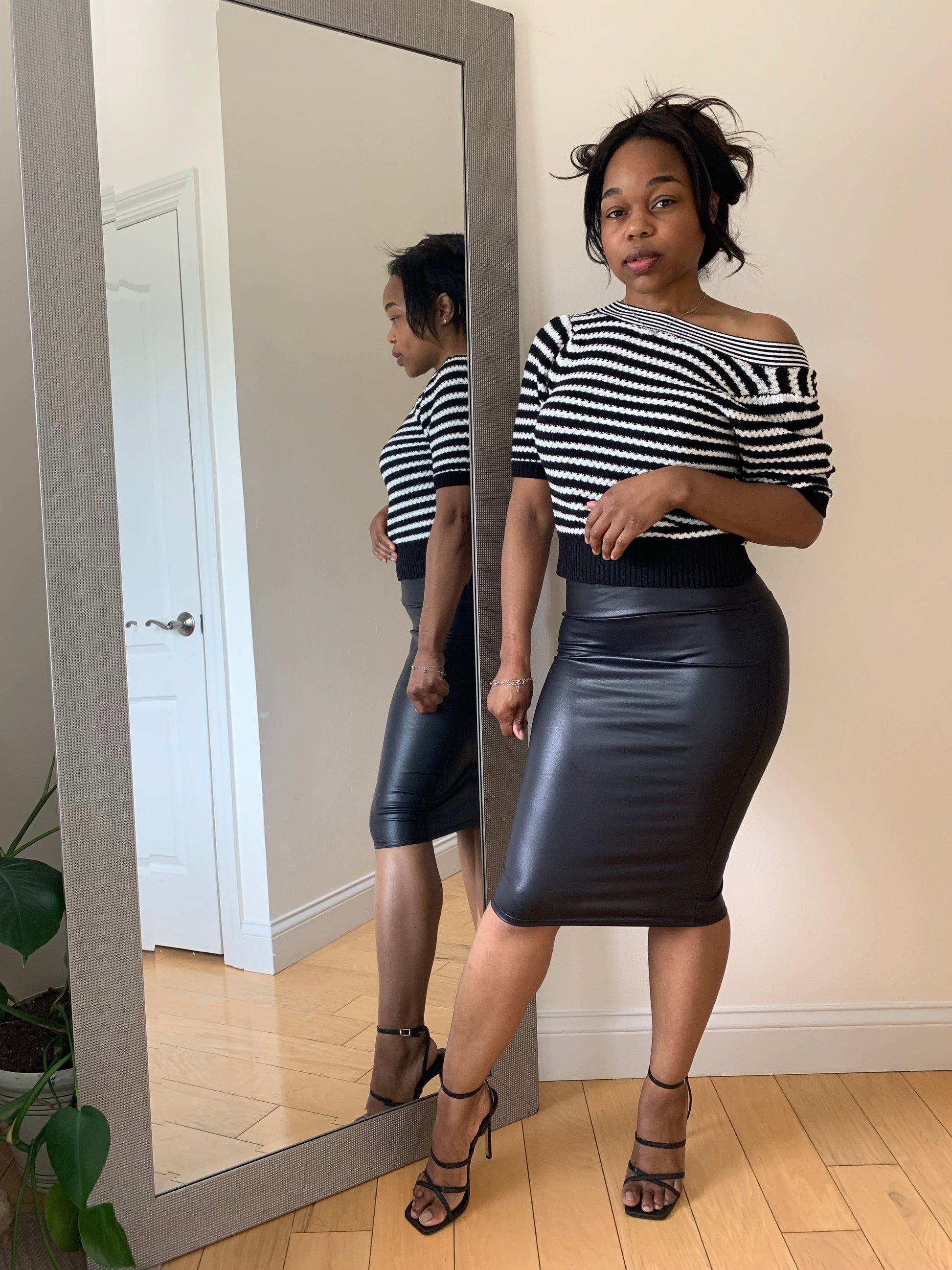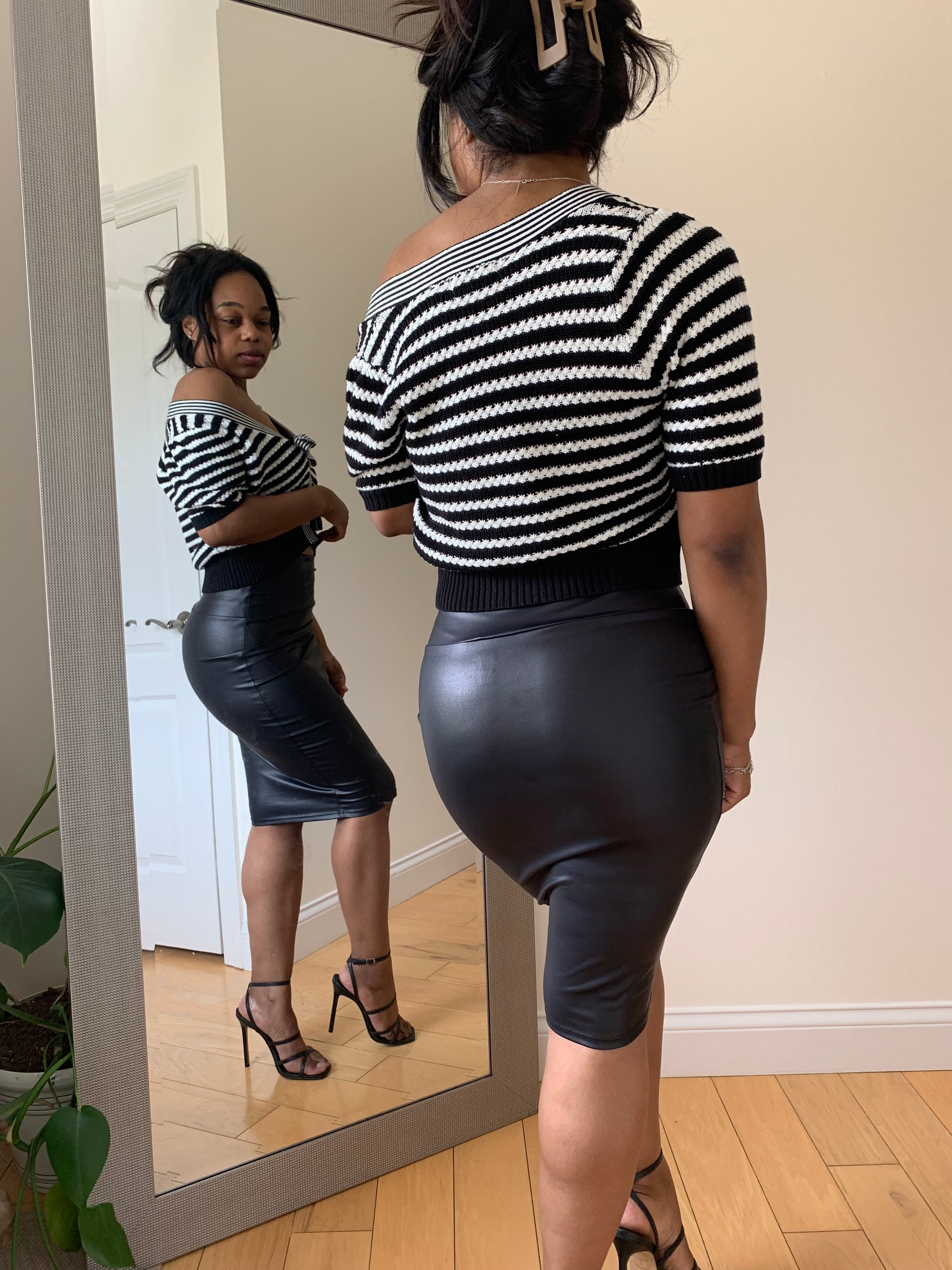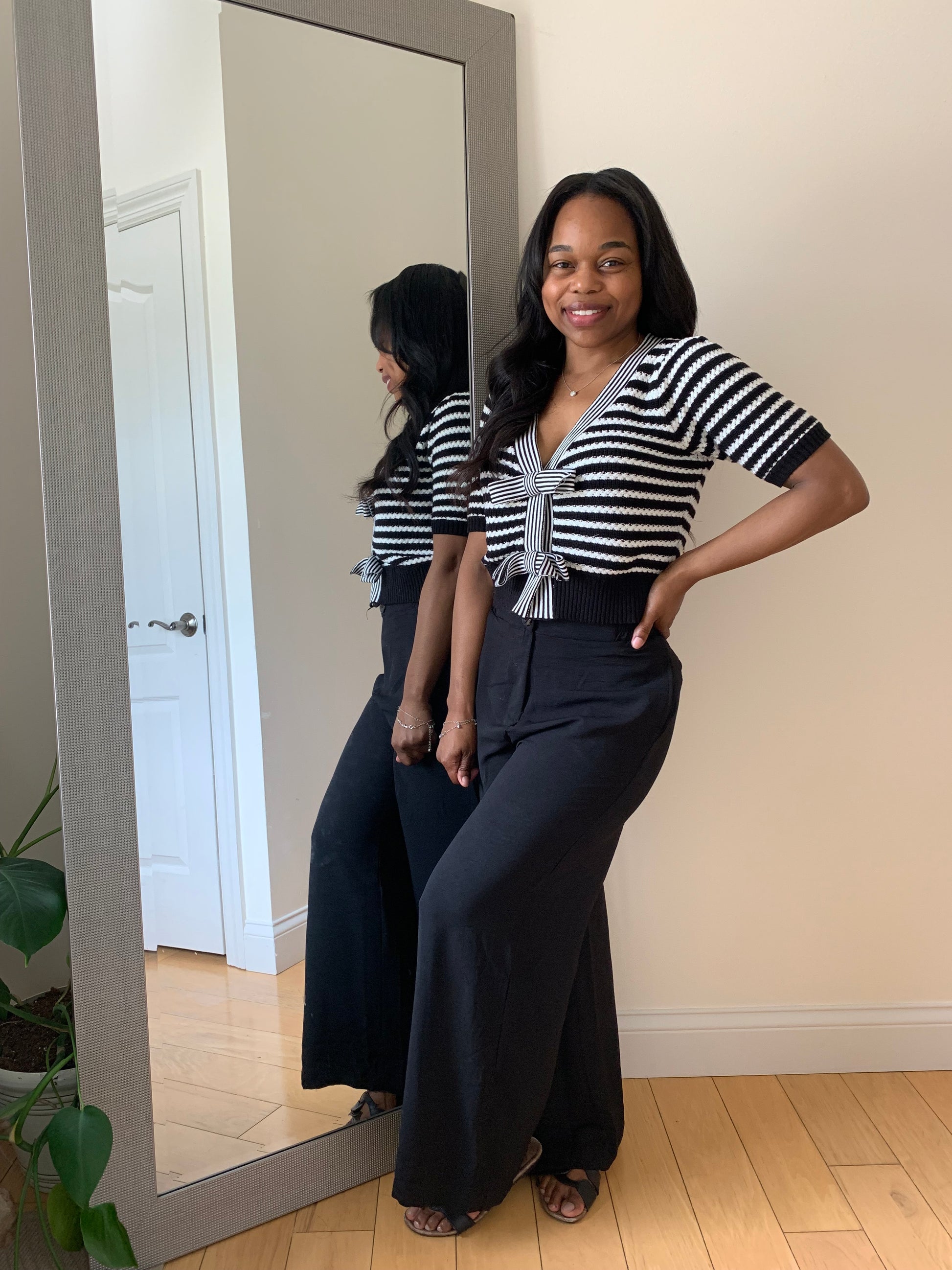 Classic with a twist. The Luxe Lines Cardigan in Black features modern stripes, a flattering v-neckline, and soft knit comfort. Pairs great with our City Sleek Trousers, our Vegan Leather Midi, or Power Flow Flow Trousers. Can be dressed up for work or night out or down for an effortless elevated casual look.