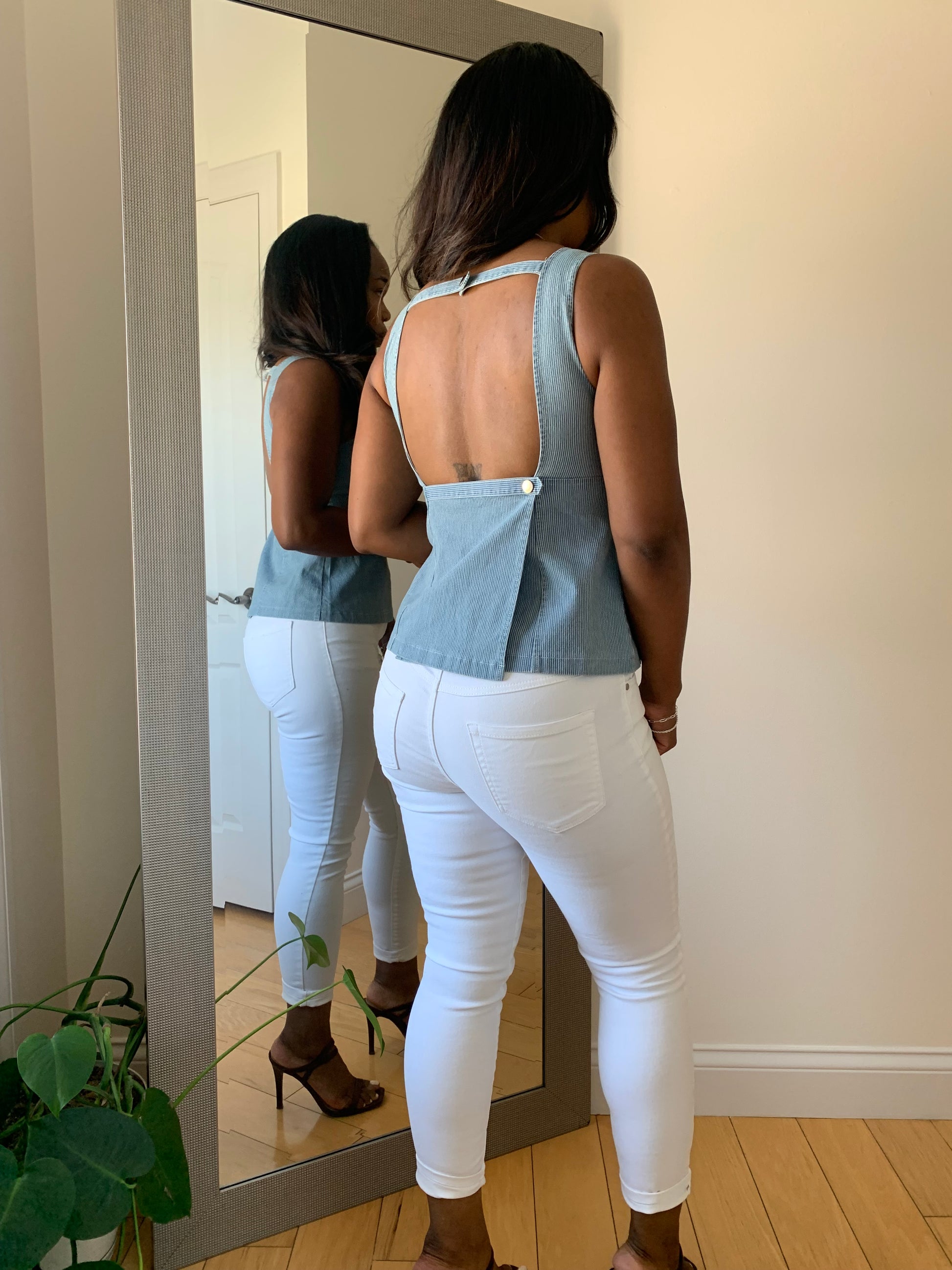 Soft structure meets elevated cool in The Noelle Tank. Designed with a sleek boatneck silhouette, vertical stripe texture, and an open-back detail with button accents, this top blends classic charm with a modern twist. Made from soft stretch denim, it moves with you while maintaining its polished shape—perfect for pairing with high-waisted denim or crisp white trousers.